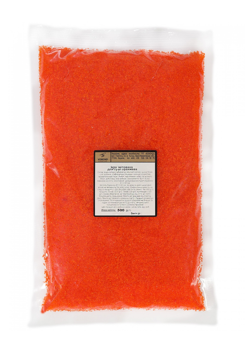 Умови зберігання: за температури +1+6 – 2 місяці; за температури –18 – 12 місяців. Ікра імітована «Для суші» – морський делікатес, новинка ринку, що заслуговує на особливу увагу справжніх гурманів. Цьому збалансованому продукту властивий смак ікри “Тобіко”. Ікра розсипчастої, сухої суміші, діаметр кожної ікринки не більше 0,5-0,8 мм. Справжньою родзинкою продукту є характерний хрускіт при вживанні.Завдяки унікальним властивостям, що імітують тобіко, ікра для суші є продуктом, який вдало доповнює страви японської кухні – суші та роли. Крім вишуканого смаку та приємних тактильних характеристик, ідентичних натуральній ікрі леткої риби, така ікра приваблює комплексом важливих для організму людини речовин – мінералів та вітамінів, заперечуючи тим самим думку про те, що корисне смачним не буває.